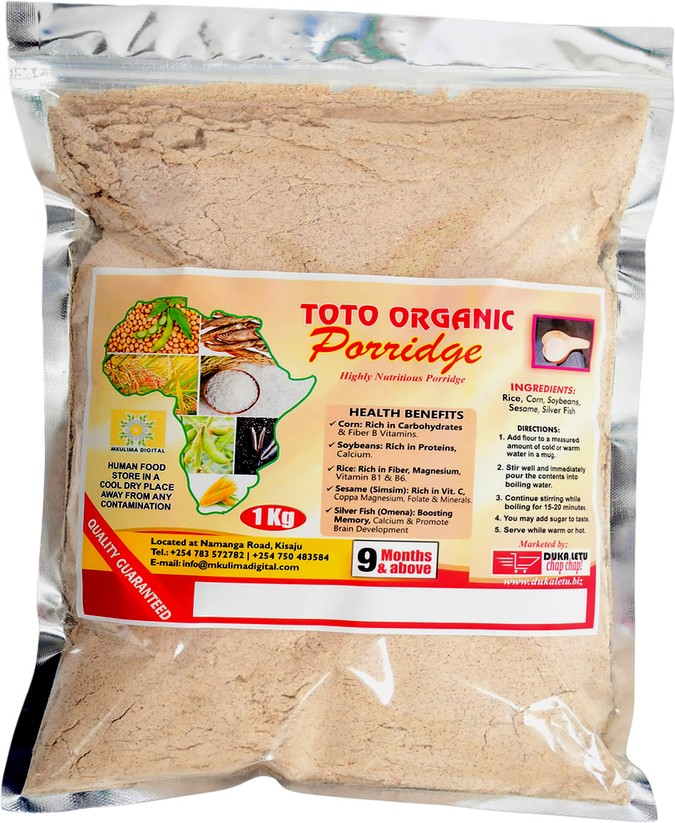 Toto Organic Porridge is a nutritious, nutrient-dense meal for kids aged 9 months and up, containing energy-boosting corn, bone-strengthening soybeans, digestion-friendly rice, and brain-boosting silver fish. It also includes sesame for overall health. The meal supports healthy growth and brain development, making it a convenient and tasty option for children.